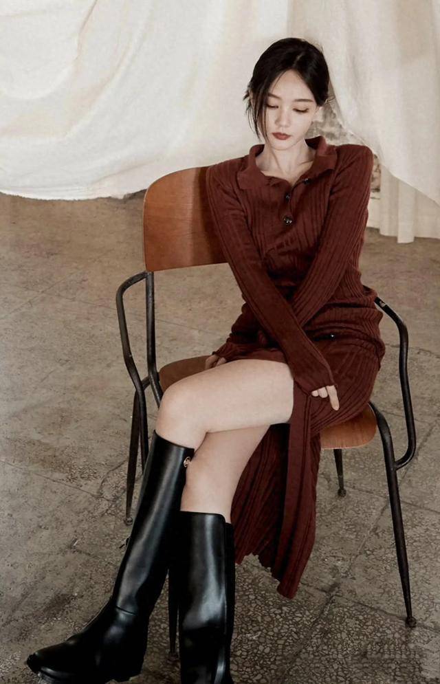 这款酒红色的裙装搭配黑色的半腿长靴,这种黑与红的搭配,鲜亮又分明,将原本保守的穿着穿出了一种性感,尤其是酒红色裙装下的开叉,更是在性感上更上一层楼。