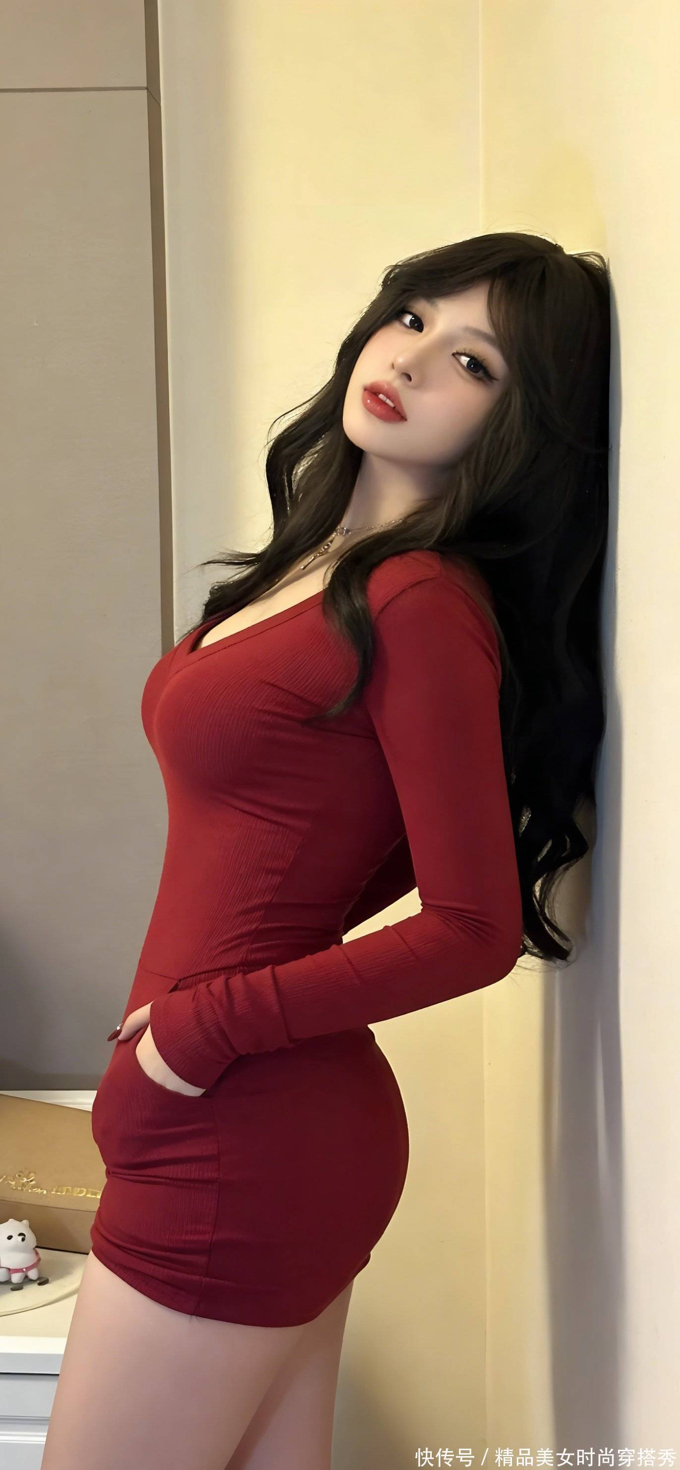 酒红色的紧身裙像第二层皮肤,把腰臀的弧度裹得恰到好处,裙边刚过大腿根,露出一截白到发光的腿,连暖黄的灯光都忍不住在上面打圈流连。